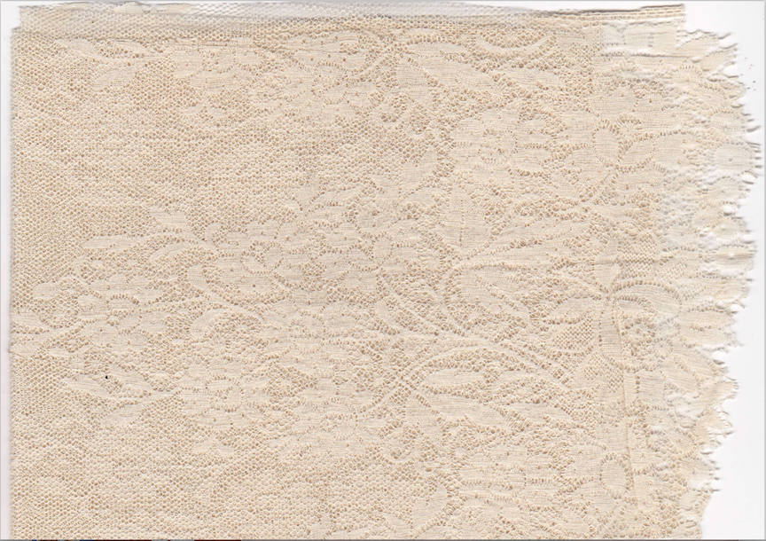 Daisy Cornick, and old family friend of my parents and one-time floorwalker in the fabric department of Marshall Field’s State Street store fetched it when she worked there as a young woman. After my girls were born and a couple of years before she died in the early ’60s, she gave it to me along with other lace pieces — narrow trim, and shorter lengths — for their wedding dresses. Such a sweet gesture, but too gorgeous and fragile and historical to use. Aside from small pieces used for trim or embellishment, it’s been tucked in a box in my studio for cdecades, waiting for the perfect reason to whack off a piece and share!